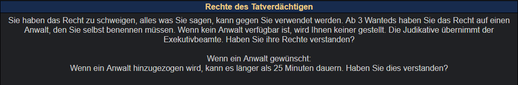 | StGB §43 | Androhung einer Straftat | ☆☆☆ | $20.000 + pro ⭐ $5.000 |